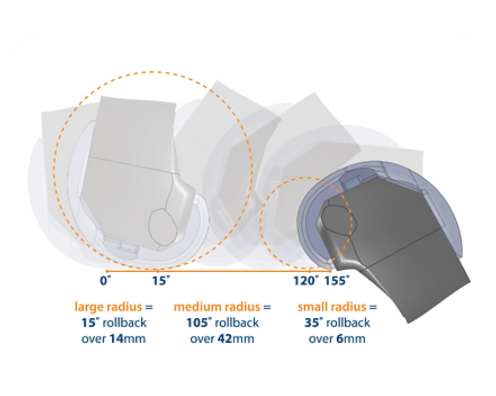 A medida que aumenta la flexión, el radio de curvatura en el plano sagital debe cambiar para acomodar un mayor o menor retroceso sobre la superficie disponible.